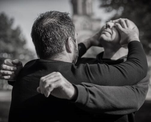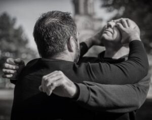 Kapap instructor demonstrates street fighting self defense technique against holds and grabs with his student
